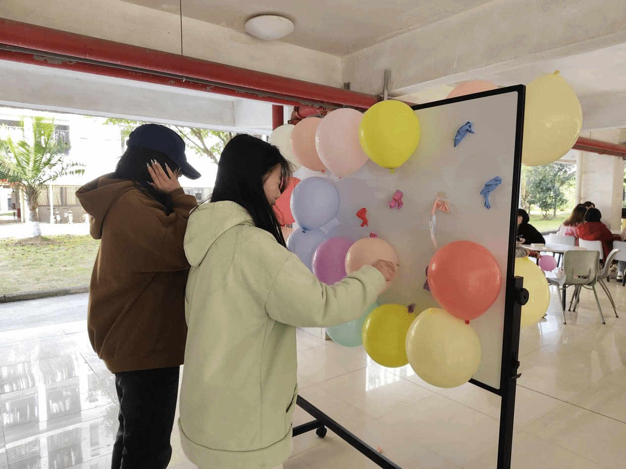 在盲盒墙前,同学们纷纷驻足,在便签纸上写下暖心寄语,并随机放入气球内,制作成“闪光盲盒”。同学们通过现场随机戳破气球盲盒,解锁暖心语录,用文字的温度治愈心灵。“不必追赶太阳,你本身就在发光”“你的存在,已经是100分的奇迹”...在“扎”破烦恼的同时,里面质朴而真挚的寄语更让同学们“爆”改坏心情。活动现场的同学表示:“在对学习感到压力烦躁的时候,收到暖心小纸条后,感觉自己的内心暖暖的。”戳破气球的清脆声响,手写语录的淡淡墨香,朋友圈刷屏的暖心话题不仅承载着同学们对自我价值的坚定肯定,更成为了这个春日里最温暖的成长纪念碑。